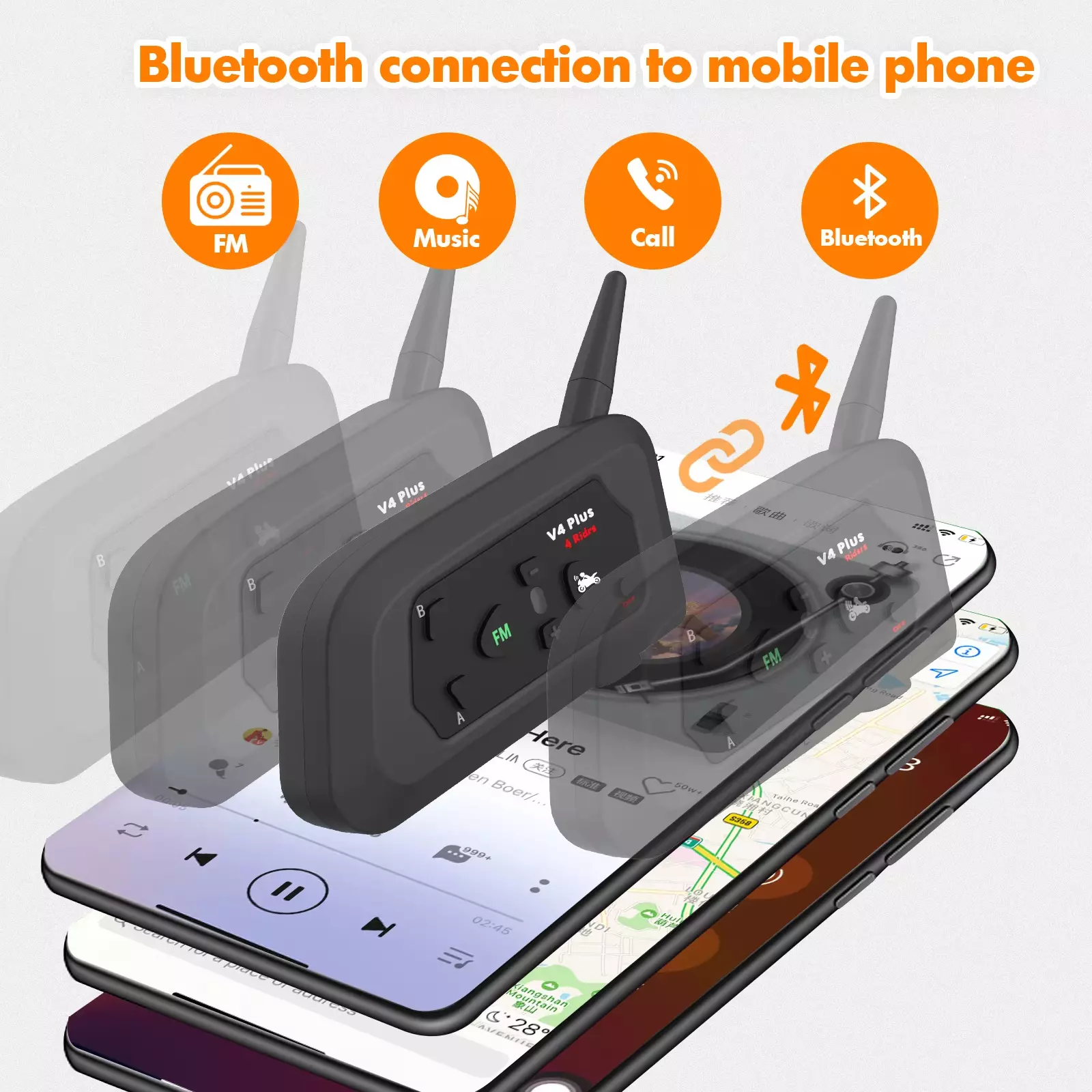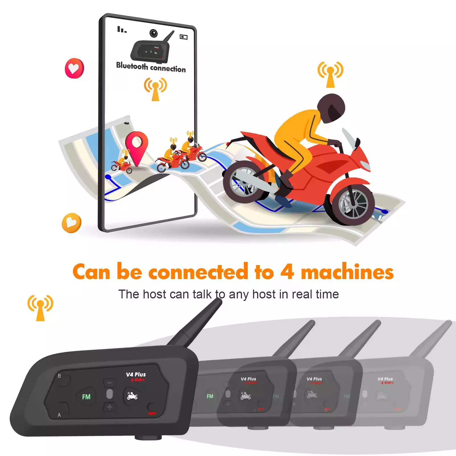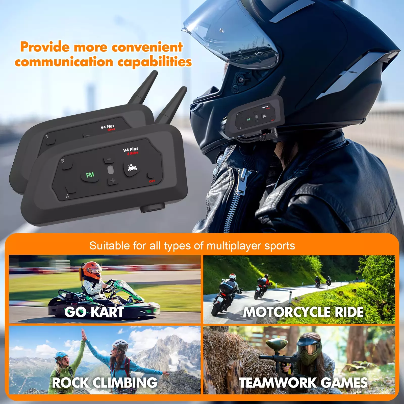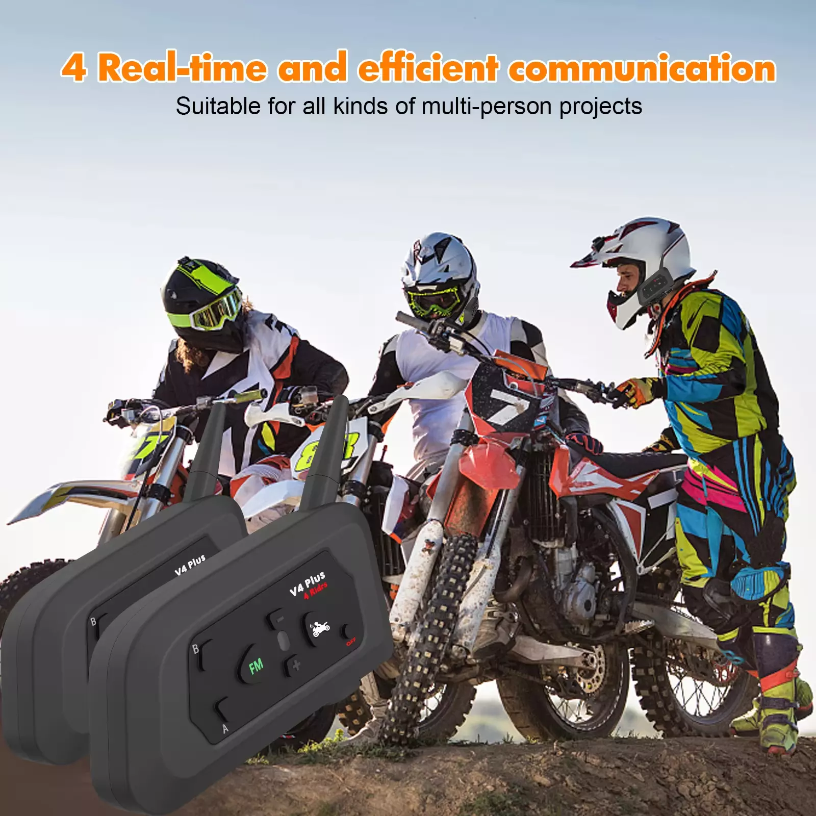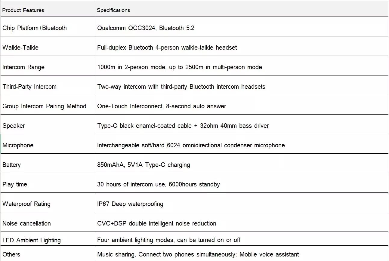 Характеристика: 4-човек пълен-дуплексна комуникация, 30-час удължен живот на батерията, FM радио функционалност, ясни и синхронизирани команди