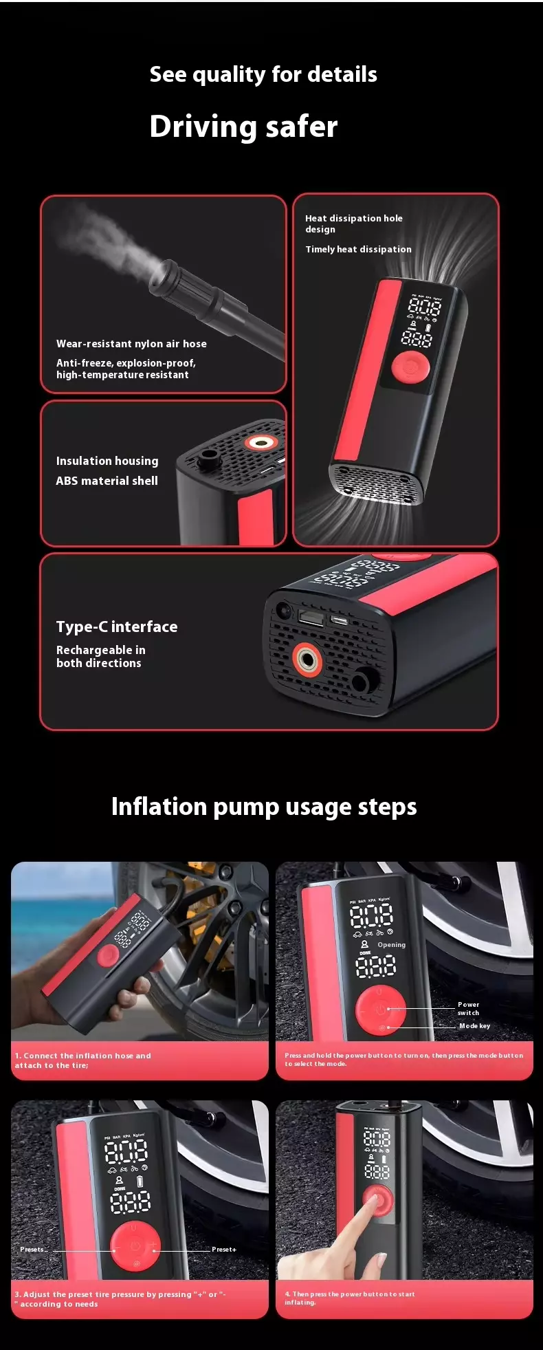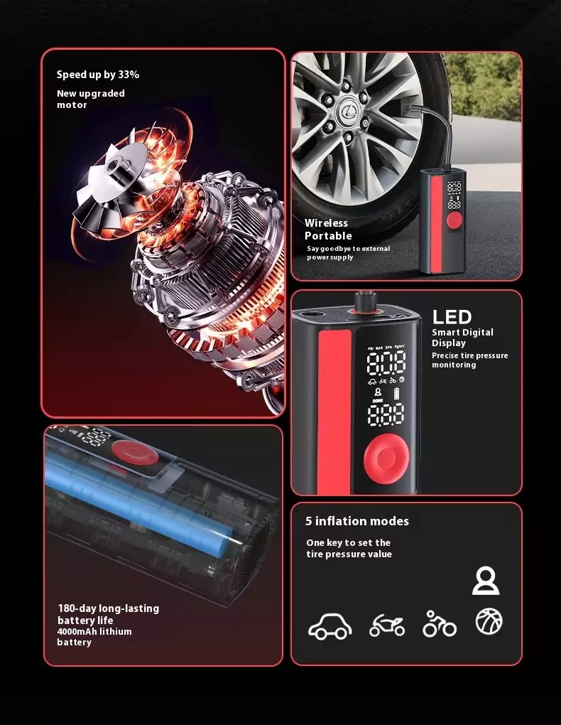 Roimhe Seo: Caidéal Inflator Boinn Gan Sreang Taispeána Digiteach Dé Luain Soilsiú Éigeandála faoi stiúir Cábla Muirearú USB Ceallraí Feidhmithe SOS