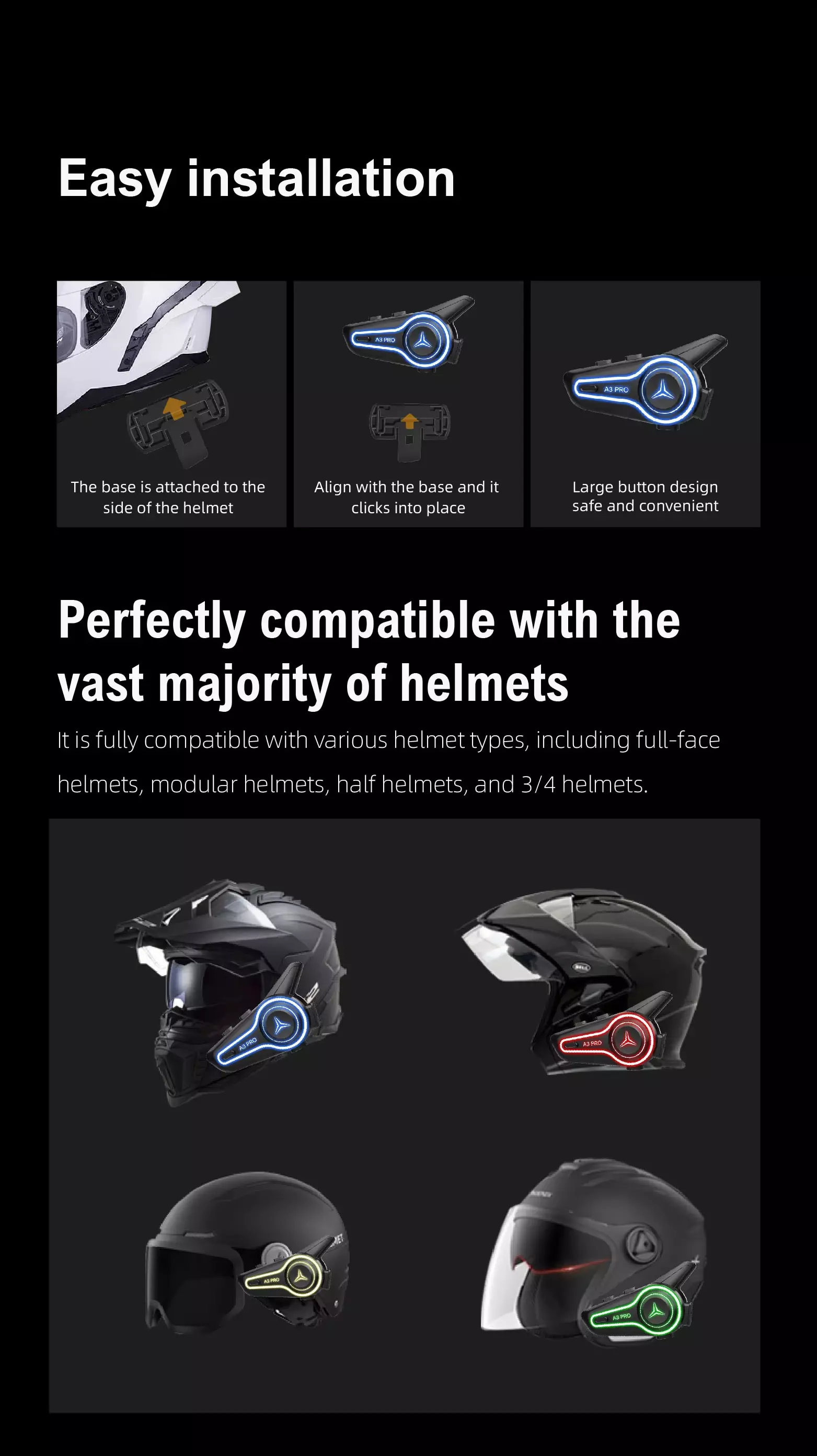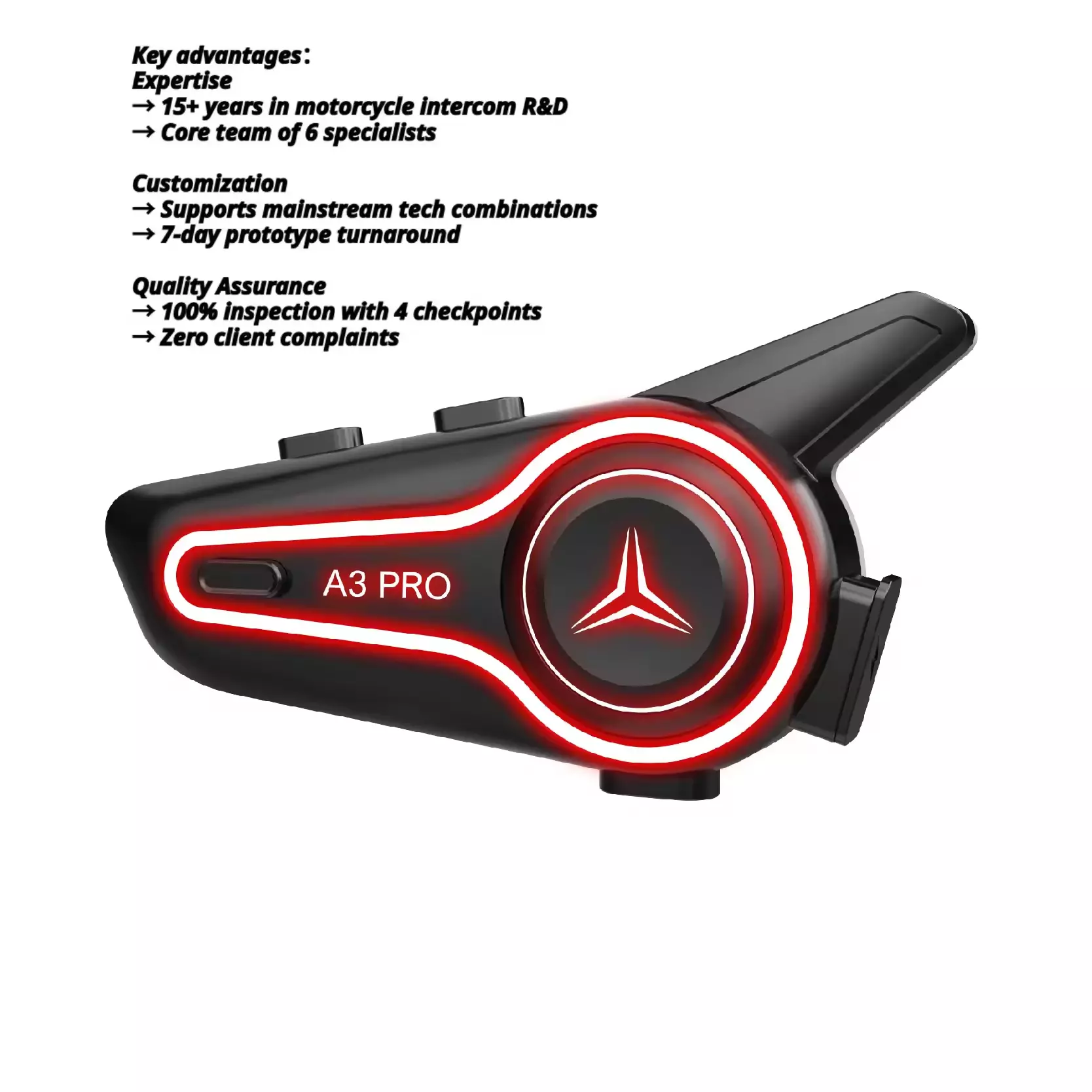 Large button design enables easy operation with gloves; voice assistant frees hands; group intercom and music sharing enhance team riding enjoyment.