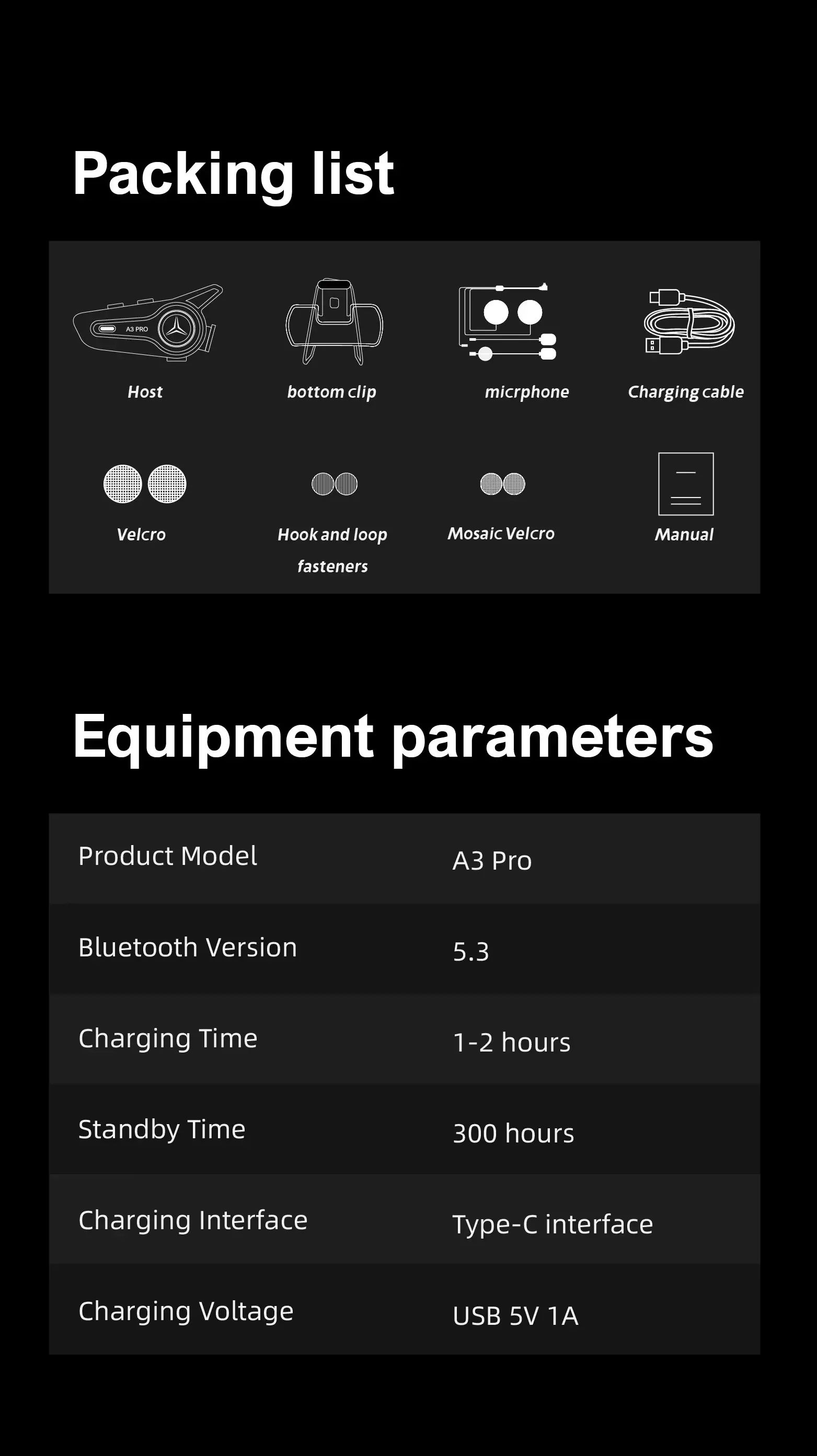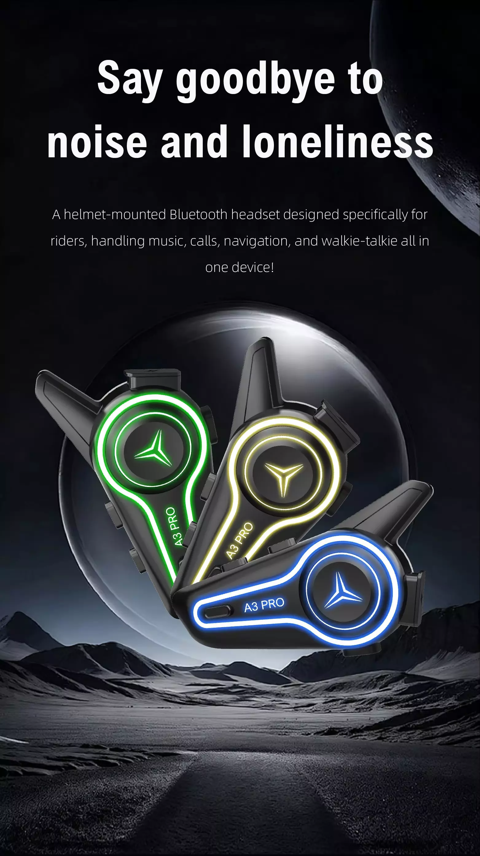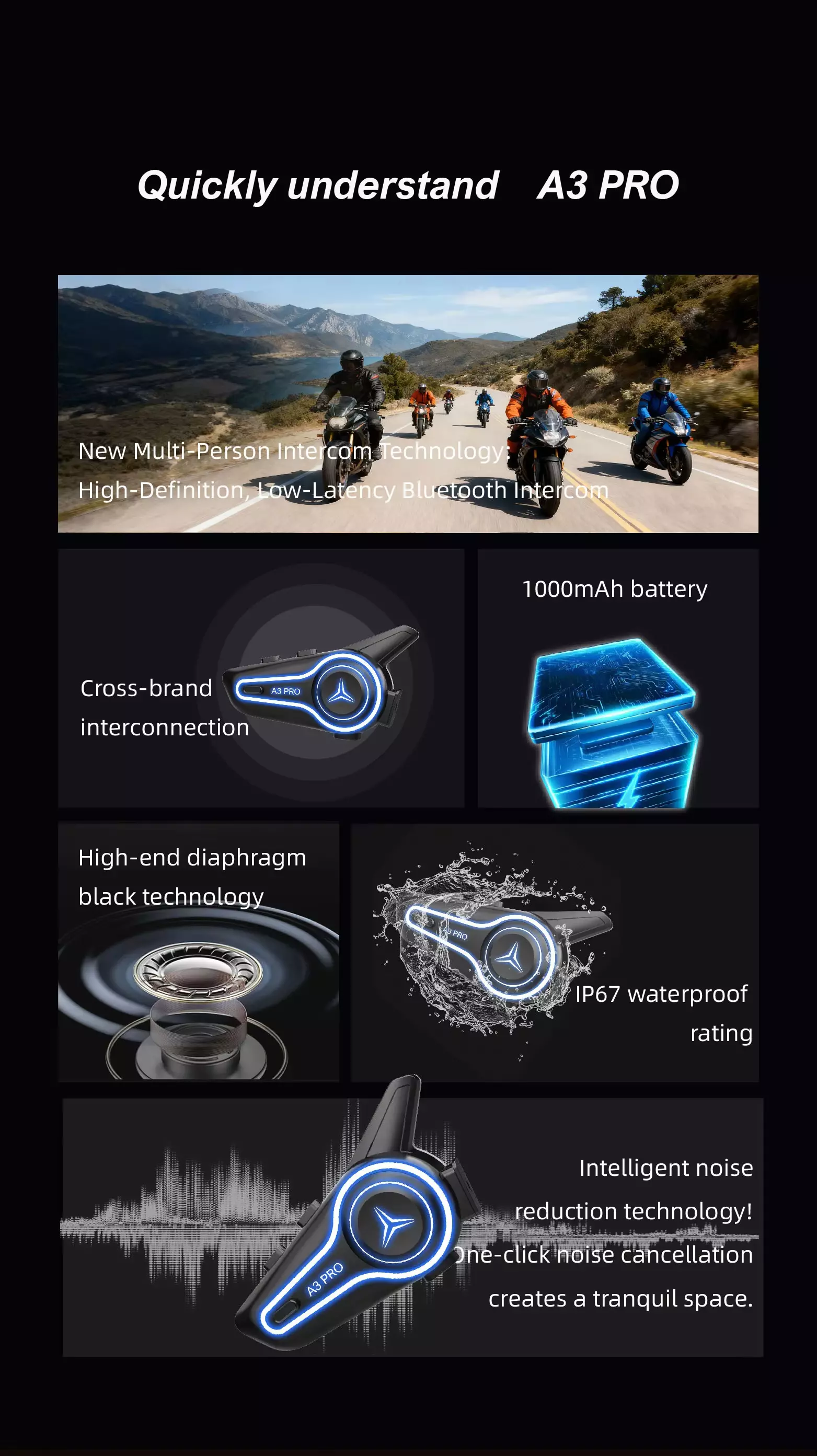 A3 PRO for 5.3 Cycling Intercom Headset with Noise Cancelling One-Touch Mute 1000m Range IP67 Waterproof for Group Riding