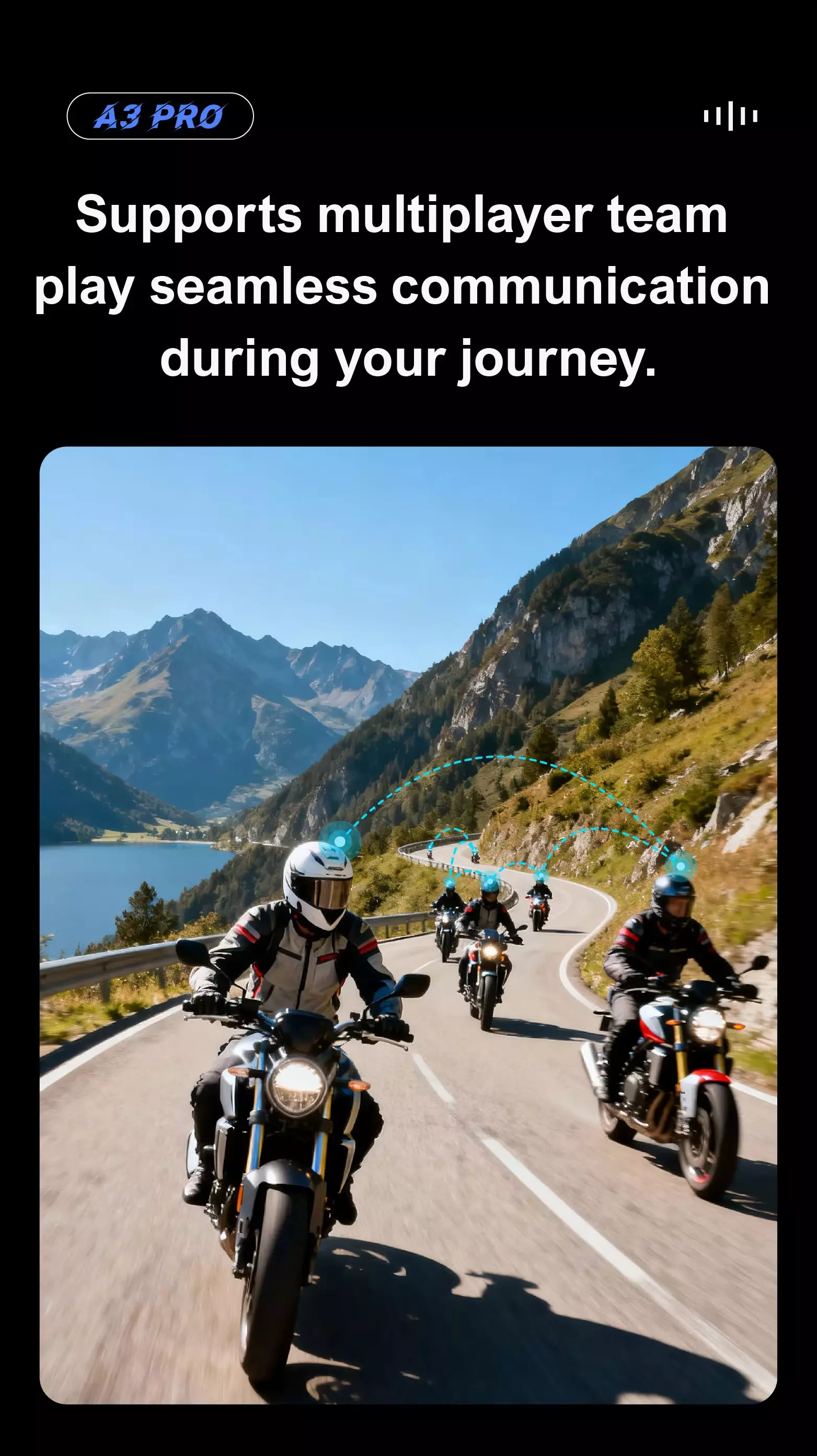 Built for the Pack. Full-duplex for 2 and half-duplex for up to 8 riders—cross-brand compatible, 1000m range. Smart noise cancellation and one-touch mute cut through wind and engine roar for crystal-clear commands.