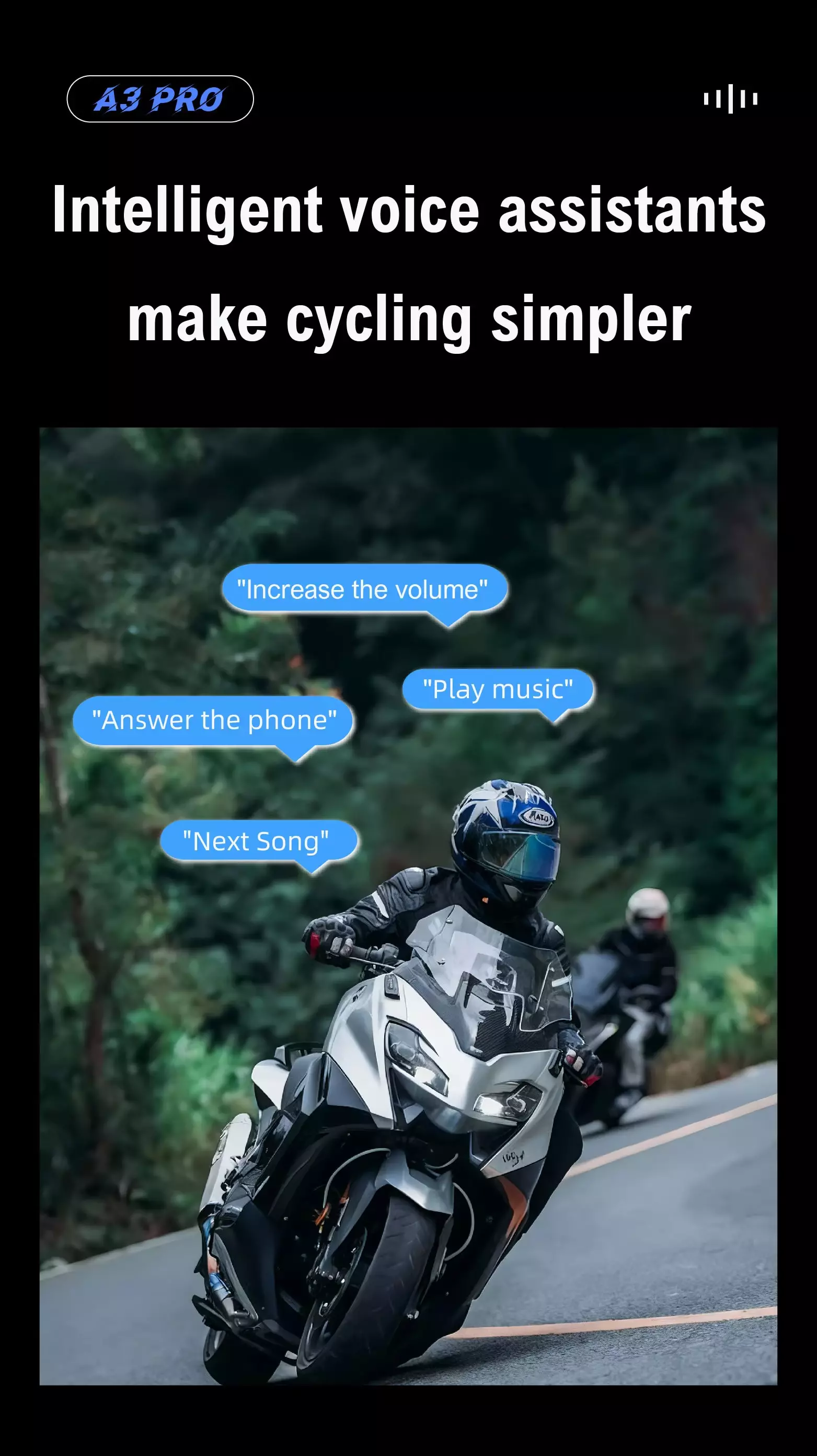 Smart noise reduction technology plus one touch mute effectively suppresses wind and engine noise, ensuring clear instructions at high speed.