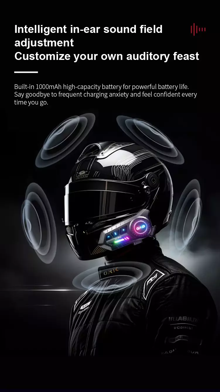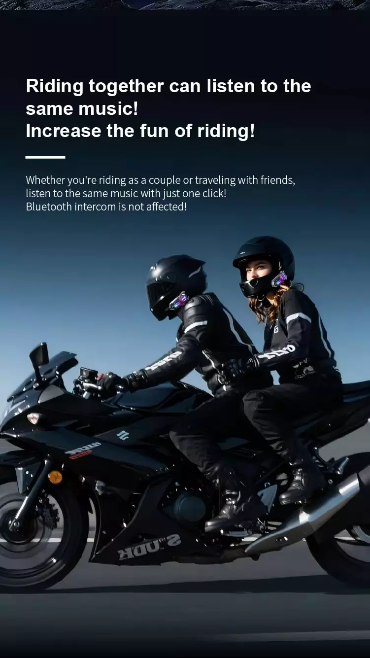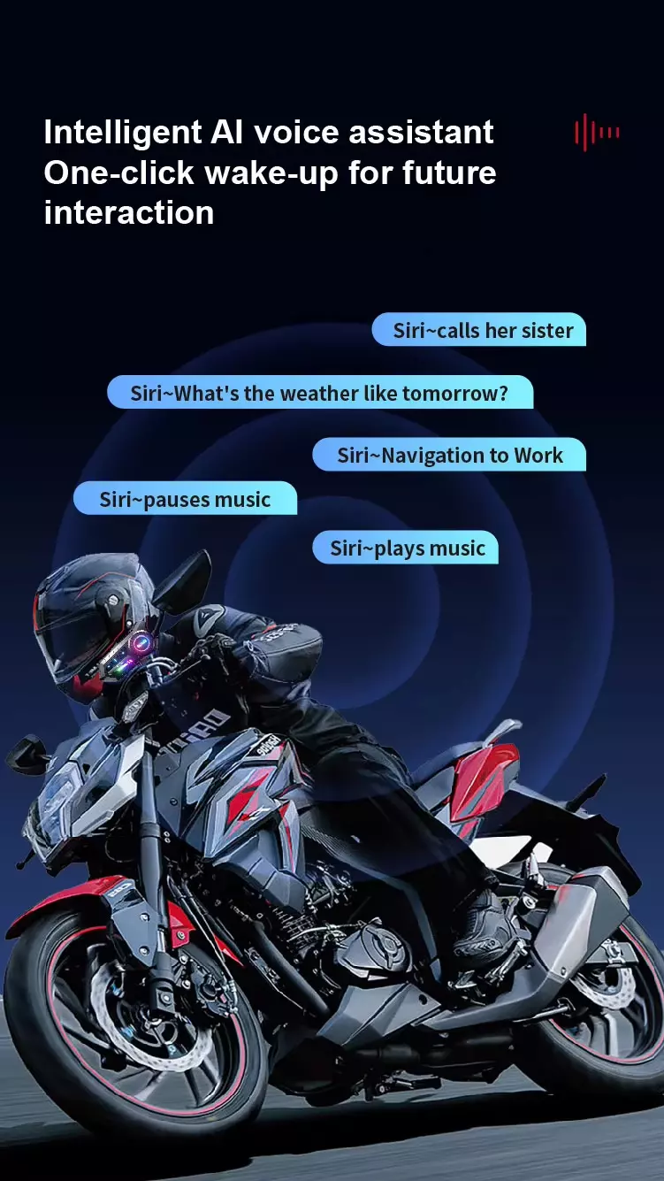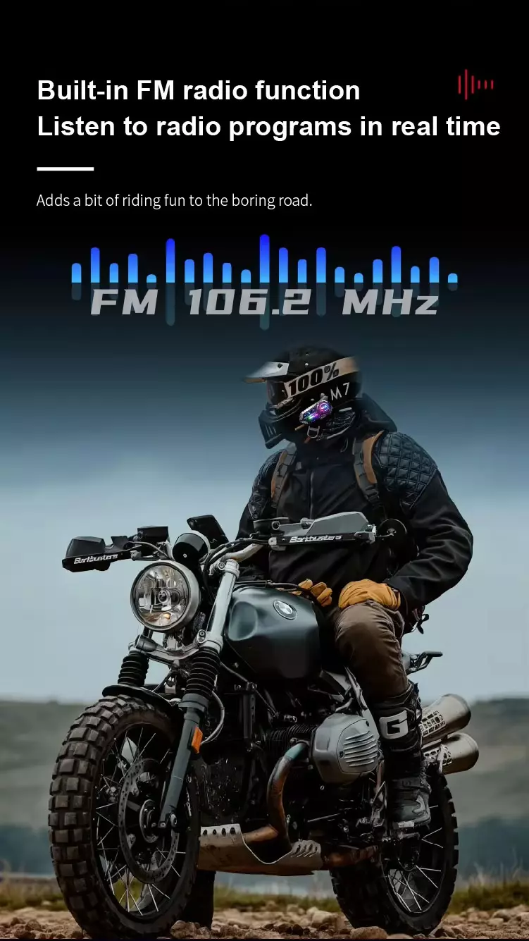 Feature:Cross-brand intercom, compatible with mainstream d, Mixing intercom + music sharing, Dual device connection, simultaneously linking nav, Smart voice assistant, activate navigation, music,, FM radio, tune in to broadcasts anytime, Bluetooth 5.3 + anti-interference chip for stable, Smart noise reduction + one-touch mute to block ba, Large button design + voice assistant for hands-fr, 1000-metre intercom range, IP67 waterproof rating + fully sealed construction