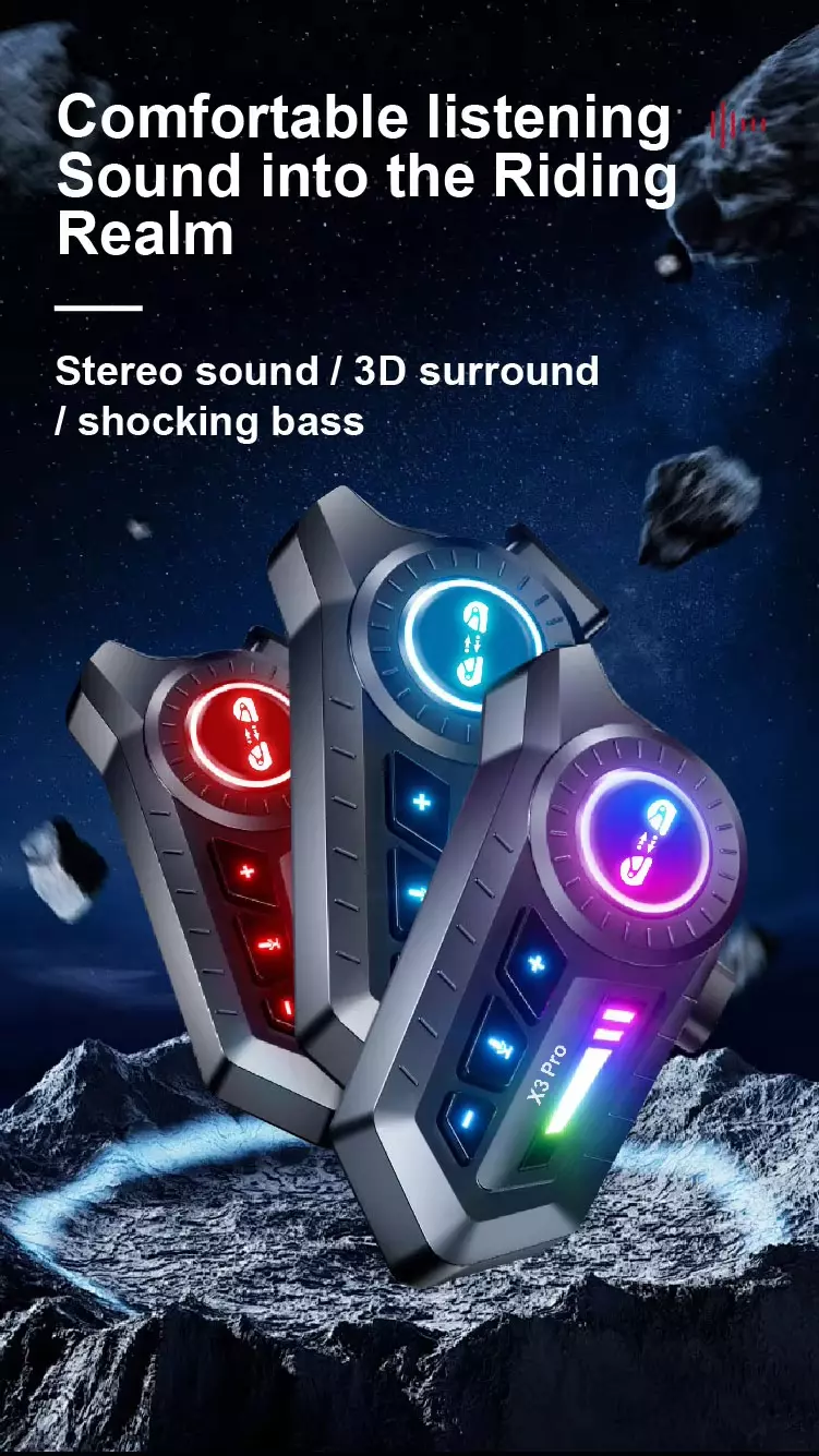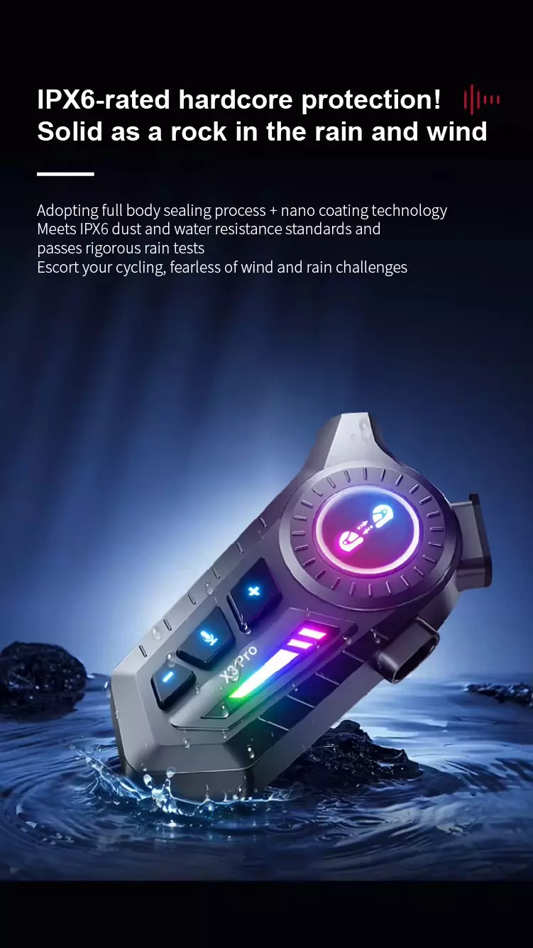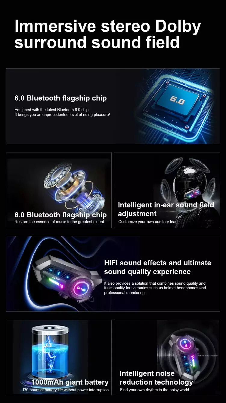 Why choose X3 Pro: engineered for the long haul. With a 1000mAh battery delivering 30 hours of use, smart noise cancellation, and rock‑solid Bluetooth 6.0, it conquers wind noise and keeps you connected mile after mile. Need more? Break free from brand limits with cross‑brand intercom, mixed audio sharing, and dual‑device connectivity—run intercom, music, and navigation simultaneously. 30 hours of power, crystal‑clear calls even in the wind, and seamless group communication. Ride focused, ride together.